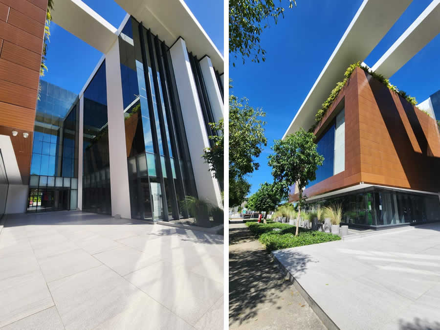 The expansive glass walls of all the facades guarantee views and natural light to most of the premises; along with the brick-colored ACM (aluminum composite) panels, these are the materials used on the facades to emphasize the project's volume. The carefully maintained and austere landscaping is staggered and integrates stone and cylindrical planters of varying heights, complementing the architecture and serving as a filter for the movement of the avenue.